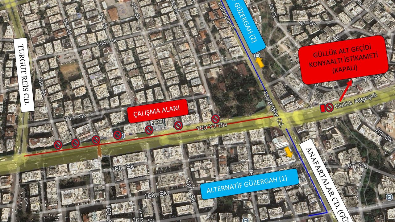 15 Şubat Pazar günü saat 07.00 itibarıyla, 100. Yıl Bulvarı’nın şehir merkezi istikametinden Konyaaltı yönüne gidiş kısmında, Anafartalar Caddesi (Güllük) ile Turgut Reis Caddesi arasında kalan bölüm trafiğe kapatılacak.