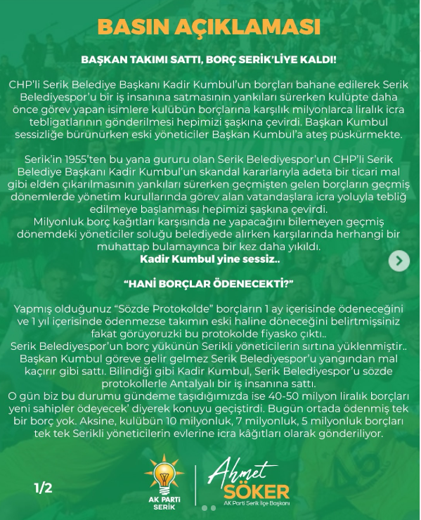Söker, “Serik Belediyespor’un borç yükünü Serikliler çekiyor. Başkan Kumbul ise sessizliğini koruyor. Hani borçlar ödenecekti?” diyerek tepki gösterdi.