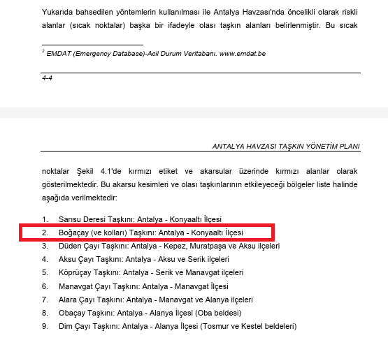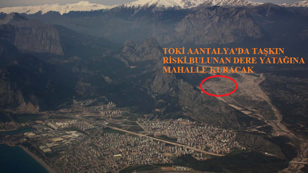 2016 yılında, dönemin Orman ve Su İşleri Bakanlığı tarafından hazırlanan Antalya Havzası Taşkın Yönetim Planı’nda da bölge taşkın riski bulunan yerler arasında gösteriliyor. Dere yatağı ve dağ eteğindeki arazi, hızlı gelişen seller için de risk taşıyor. Ancak TOKİ’nin hazırladığı ÇED raporunda (Proje Tanıtım Dosyası), “Planlanan proje sahasında proje kriterlerini etkileyecek yavaş gelişen, hızlı gelişen ve ani gelişen seller söz konusu değildir” ifadelerine yer verilmesi dikkati çekiyor.