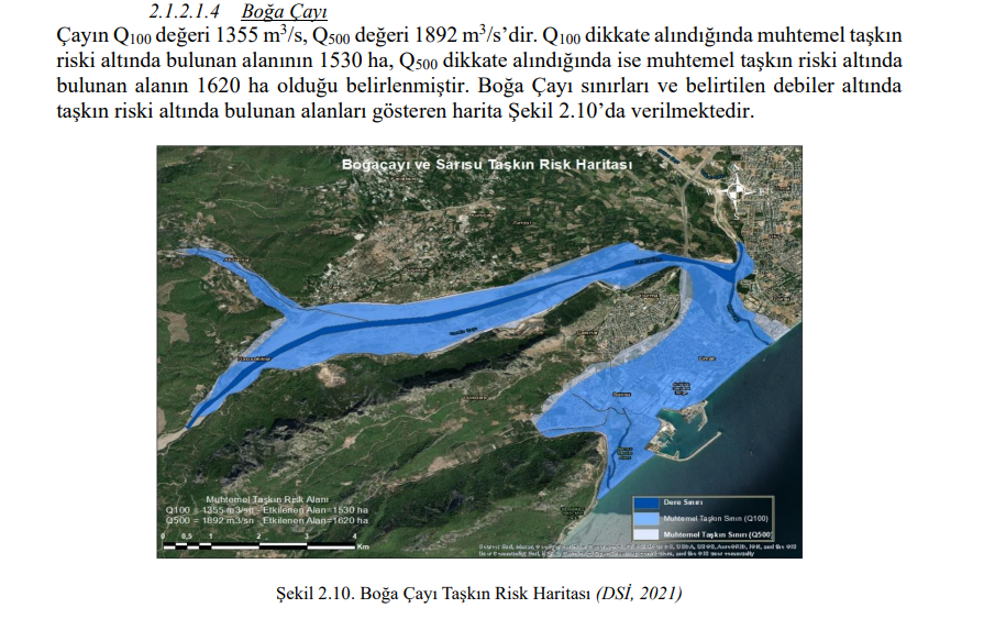 AFAD’ın 2021 yılında hazırladığı Antalya İl Afet Azaltma (İRAP) Raporu’na göre TOKİ’nin yeni kuracağı mahalle taşkın riski altındaki bölgede yer alıyor. Boğaçayı ve kollarını etkileyecek taşkın riski haritasına da yer verilen raporda, 1620 hektarlık alanı etkilemesi beklenen senaryoya değinilerek şu ifadelere yer veriliyor: “Boğa Çayı Çayın Q100 değeri 1355 m3 /s, Q500 değeri 1892 m3 /s’dir. Q100 dikkate alındığında muhtemel taşkın riski altında bulunan alanının 1530 ha, Q500 dikkate alındığında ise muhtemel taşkın riski altında bulunan alanın 1620 ha olduğu belirlenmiştir. Boğa Çayı sınırları ve belirtilen debiler altında taşkın riski altında bulunan alanları gösteren harita Şekil 2.10’da verilmektedir.”