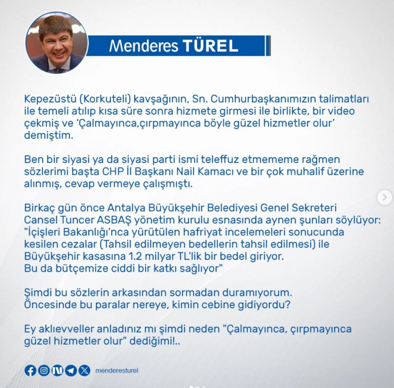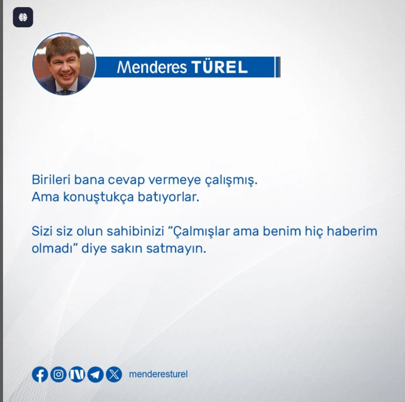 Eski Antalya Büyükşehir Belediye Başkanı ve AK Parti MKYK üyesi Menderes Türel, bugün sosyal medya hesabından imalı bir paylaşımda bulundu. Paylaşımda “Birileri bana cevap vermeye çalışmış. Ama konuştukça batıyorlar. Sizi siz olun sahibinizi ‘Çalmışlar ama benim hiç haberim olmadı’ diye sakın satmayın” ifadelerini kullandı.