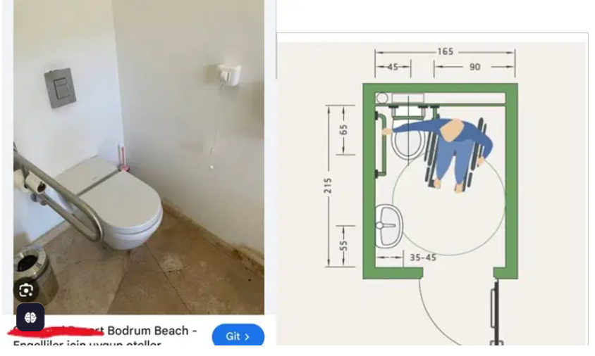 Arama motorunda engelliler için uygun oteller araması yaptığınızda karşınıza çıkan dünyaca ünlü bir otel markasının tuvaleti aslında engelliler için uygun değil, sağdaki gibi tasarlanmış olması gerekiyor, engellini klozete yanaşması için boşluk olması gerekiyordu. Buna benzer örneklere sıkça rastlamak mümkün.