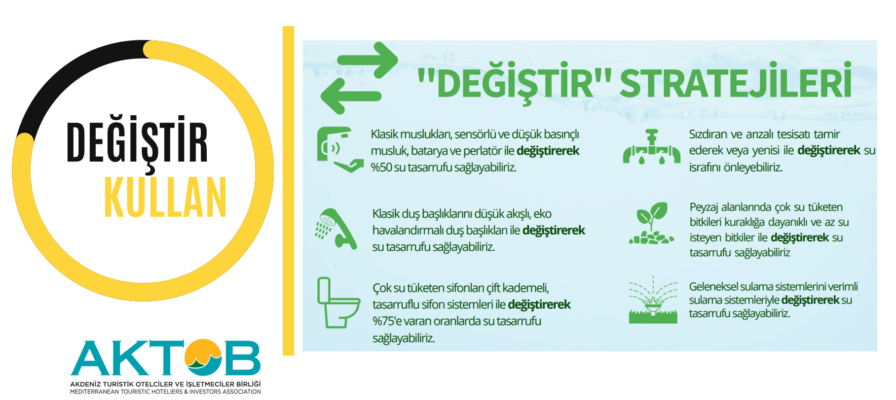 Türkiye’nin en fazla otel ve yatak kapasitesine sahip kenti Antalya, bu kez su tasarrufu için harekete geçti. Akdeniz Turistik Otelciler ve İşletmeciler Birliği (AKTOB), “1 Damla 1 Dünya” adlı projeyle 306 bin 532 odanın bulunduğu 2 bin 760 otelde su israfını önlemeyi hedefliyor. Projenin startı kasım ayında düzenlenecek Turizm Resort Kongresi’nde verilecek.