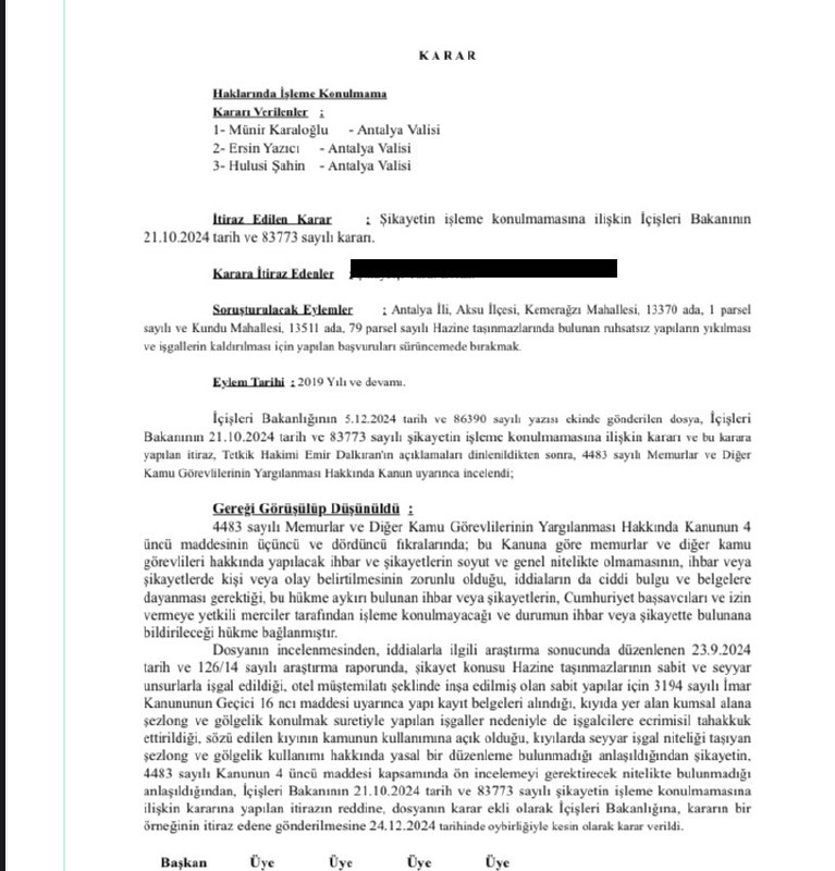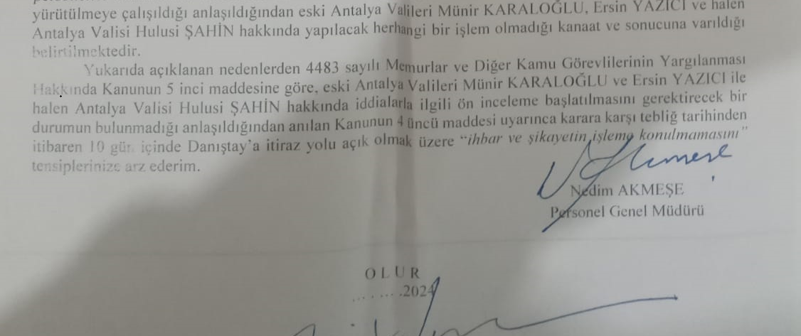İçişleri Bakanlığı’nın valiler hakkında soruşturma izni verilmemesi yönündeki kararına Danıştay’da itiraz eden vatandaş, 11 Kasım 2024 tarihli itiraz başvurusunda, Antalya Valiliği’nin denetim ve kontrol görevini yerine getirmediğini öne sürerek İçişleri Bakanlığı’nın kararının iptalini talep etmişti. Danıştay, 24 Aralık 2024 tarihli kararında, söz konusu şikâyetin 4483 Sayılı Kanunun 4. Maddesi kapsamında ön incelemeyi gerektirecek nitelikte bulunmadığını belirterek başvurucunun itirazını reddetmişti.