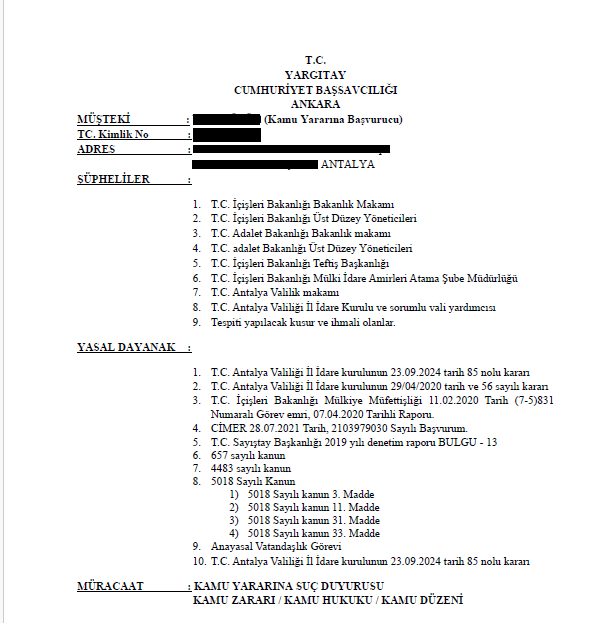 Kamu arazilerinin işgali ve imara aykırı yapılaşmalar konusundaki şikâyet başvurularını sonuçsuz bırakan yetkililer hakkında işlem başlatmadığı iddiasıyla İçişleri ve Adalet Bakanı ile Antalya Cumhuriyet Başsavcılığı dâhil olmak üzere ilgili kamu görevlileri hakkında işlem yapılması için bu kez da Yargıtay Cumhuriyet Başsavcılığı’na kapsamlı bir dosya ile başvuruda bulunan vatandaşın şikâyet konuları arasında Kundu ve Kemerağzı da yer alıyor. Başvuru konuları arasında ayrıca Antalya’nın çeşitli bölgelerindeki imar ihlalleri ve kent suçları yer alıyor.