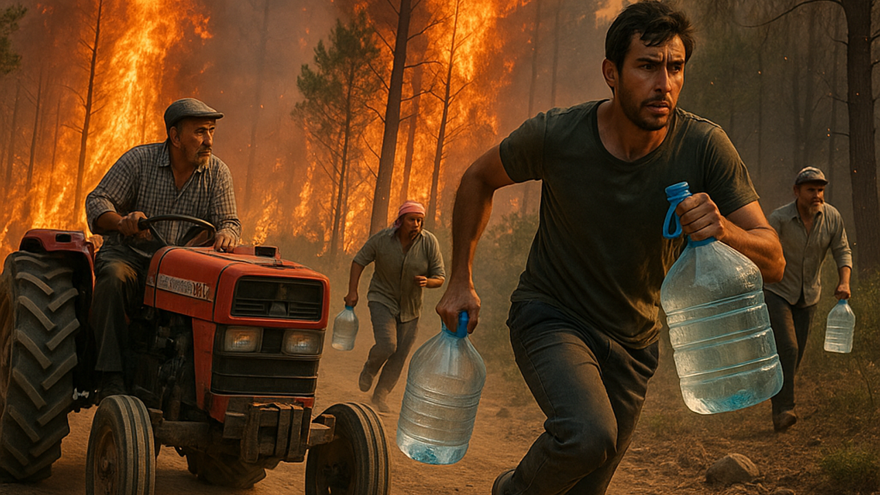 “...Yangın söndürme traktörü…Veya Yangın söndürme damacanası….Çiftçiler, köylüler, eli hortum tutan güçlü kuvvetli insanlar arkalarına su tankı bağlı traktörlere atlayıp alevlerin bulundukları yerlere gidiyor..." Oktay Pirim yazdı.