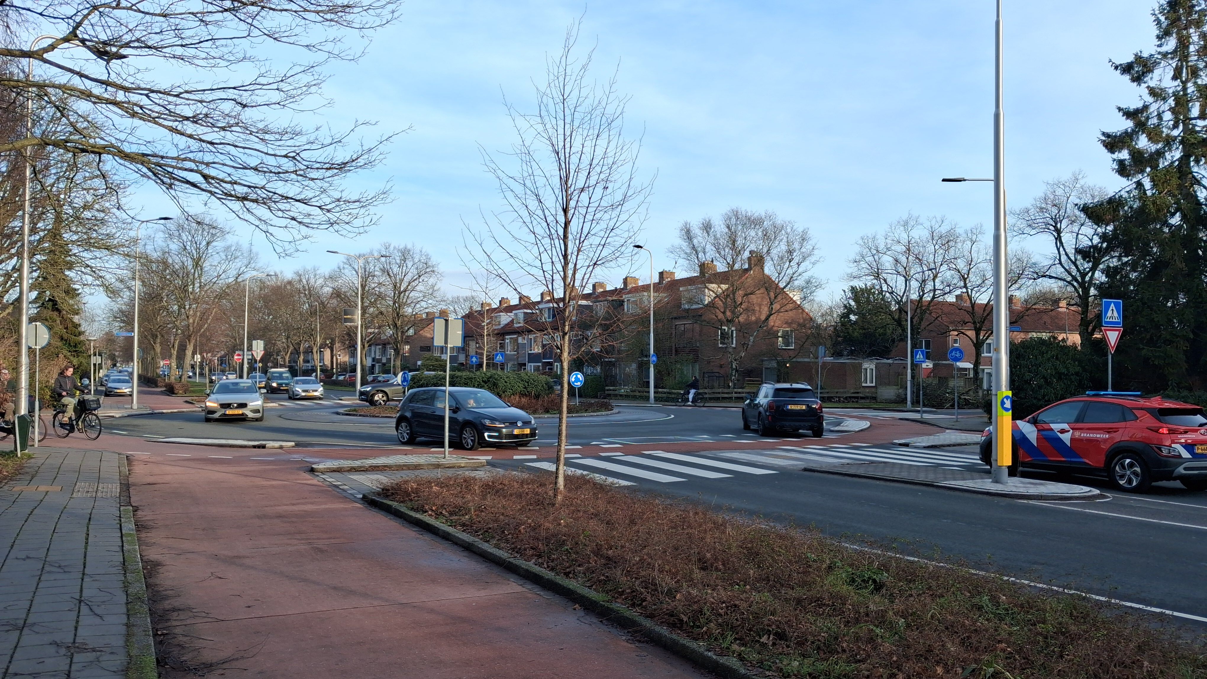 Dairenin dışında zemin rengi kırmızı bir daire daha var. Orası bisikletliler içindir. Kavşağa girecek olan ya da kavşaktan çıkacak olan araçlar, bisikletlilere mutlaka yol vermek zorundadır. Bisikletli çemberinin dışında zebra sırtı gibi yaya geçitleri yer alır. Bisikletten sonraki öncelik yayadadır.